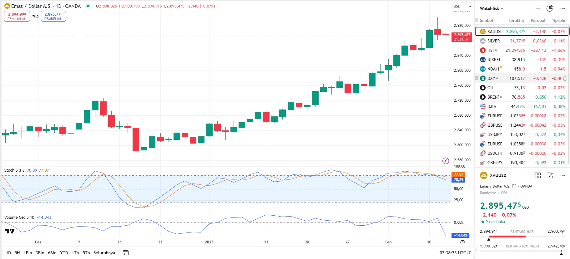 Emas stabil saat sesi awal perdagangan Asia pada Rabu (12/2) setelah mengejar ATH terbarunya $2942 pada Selasa.
